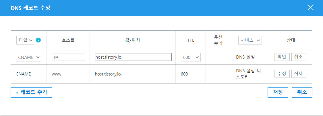 CNAME @ host.tistory.io.